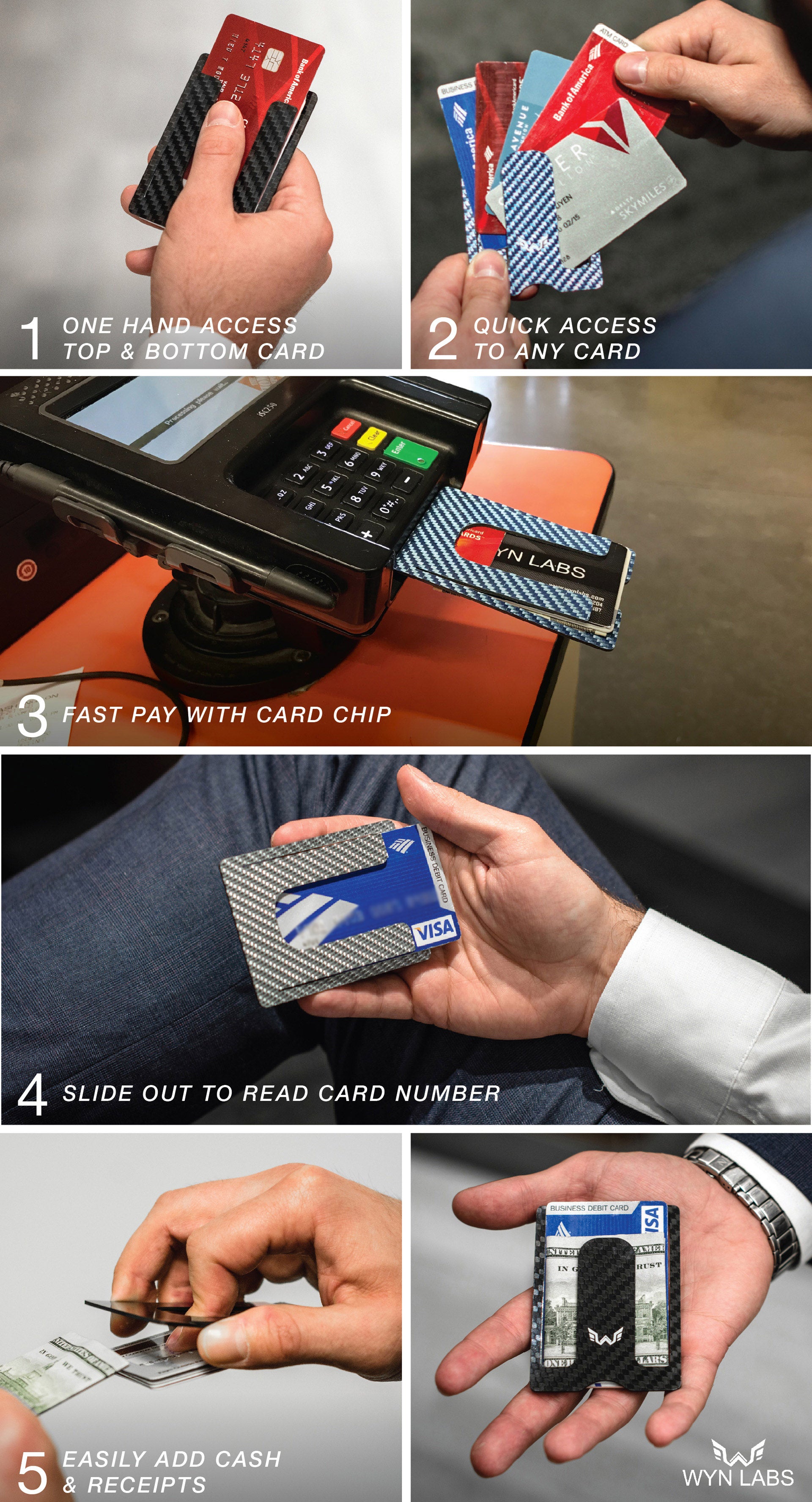 WYN has all the functionality of a full size wallet such as holding cash and receipts. It also offers the added benefits of easy access to your most used cards, fast payments with card chips and full card view for phone orders. All of this happens quickly and effortless with just one hand.